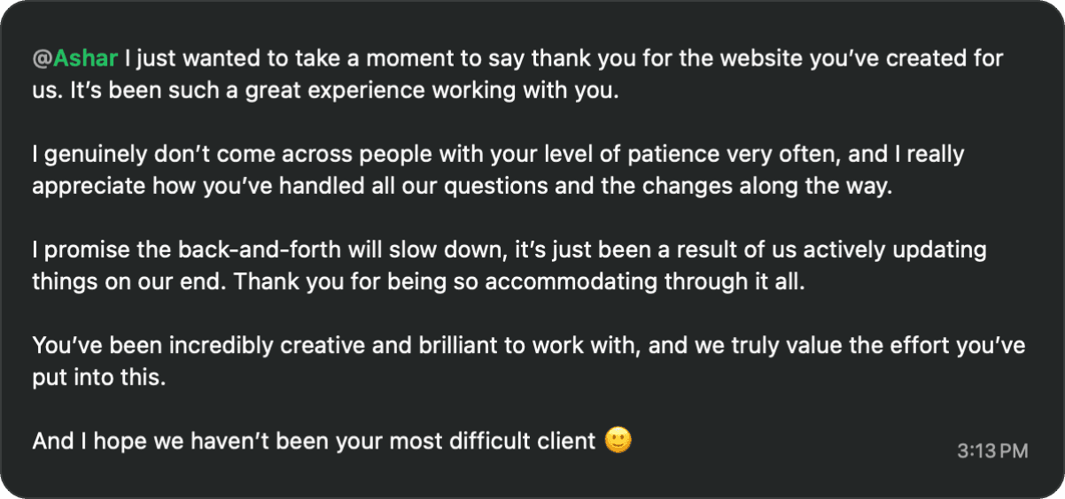 I feel like Aladdin because I found a diamond in the rough. More than anything Ashar is a sure bet. He's reliable, quick, skilled, and to sweeten the deal, kind. He takes feedback very well and is always down to test and try things to support your vision. He's a great digital designer and a good person.